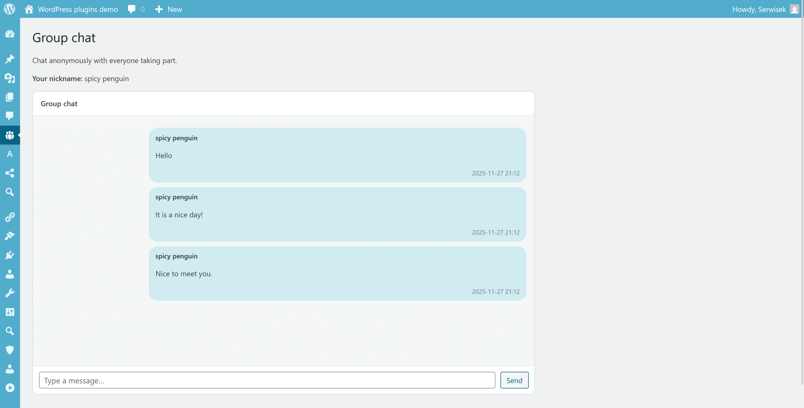- Wtyczka oferuje dwa typy komunikacji: anonimowe czaty 1:1 oraz czat grupowy. W panelu „My Gift & Chats” uczestnik ma dwa okna czatu: z osobą, której daje prezent, oraz z tym, kto daje prezent jemu. Użytkownicy nie widzą swoich loginów ani adresów e-mail – rozmawiają wyłącznie w ramach wtyczki, a wiadomości są oznaczone jedynie jako wysłane lub odebrane. Dodatkowo w zakładce „Group chat” dostępny jest czat dla wszystkich uczestników danej edycji, gdzie każdy otrzymuje losowy pseudonim w stylu „sunny penguin”. Ten czat świetnie sprawdza się do luźnych rozmów, ustalania szczegółów wymiany czy zadawania ogólnych pytań. System automatycznie odświeża widok i może wysyłać powiadomienia e-mail o nowych wiadomościach.