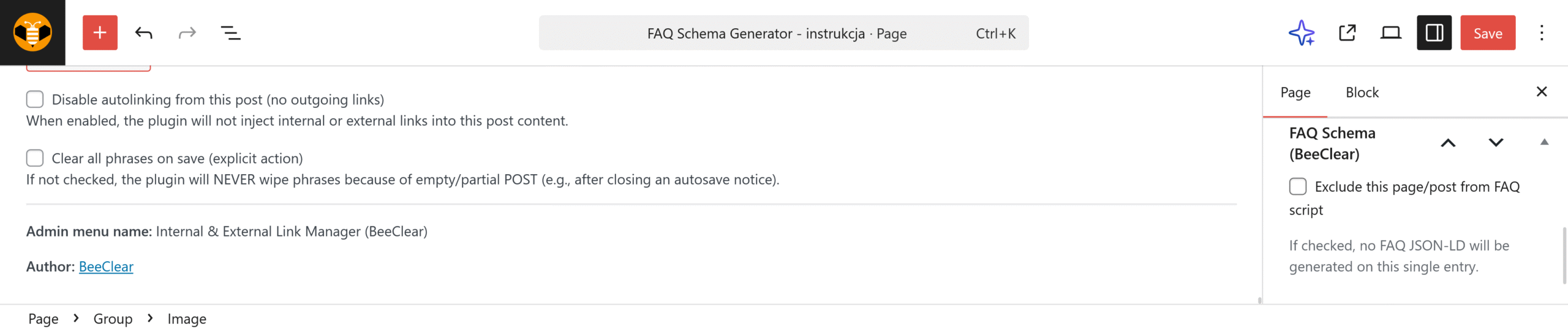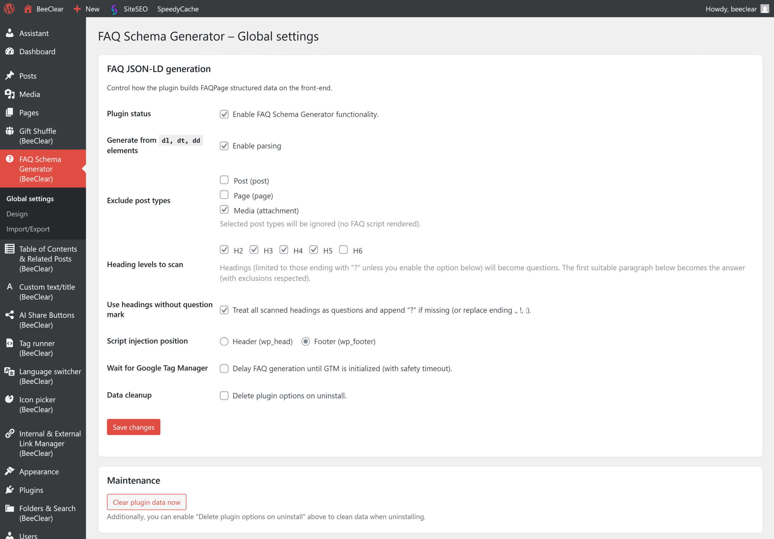 In the WordPress block editor, the plugin adds a FAQ Schema (BeeClear) section in the sidebar (on the right). This setting applies only to the current post or page.