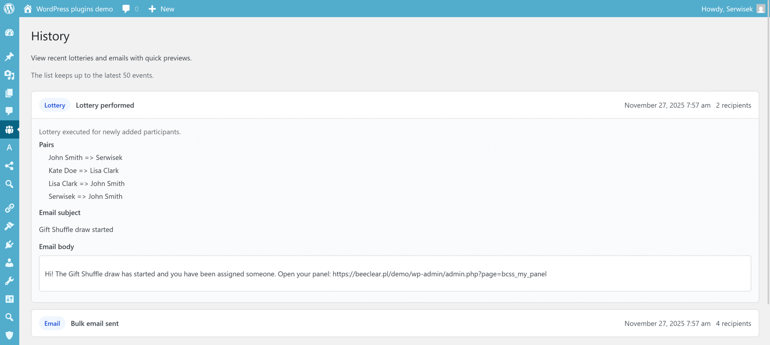 The History tab lets you review up to the last 50 events — draws, resets, sent emails and setting changes. This is useful for keeping everything transparent and for having an archive for future editions.