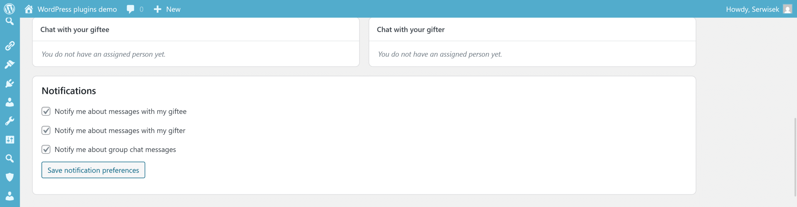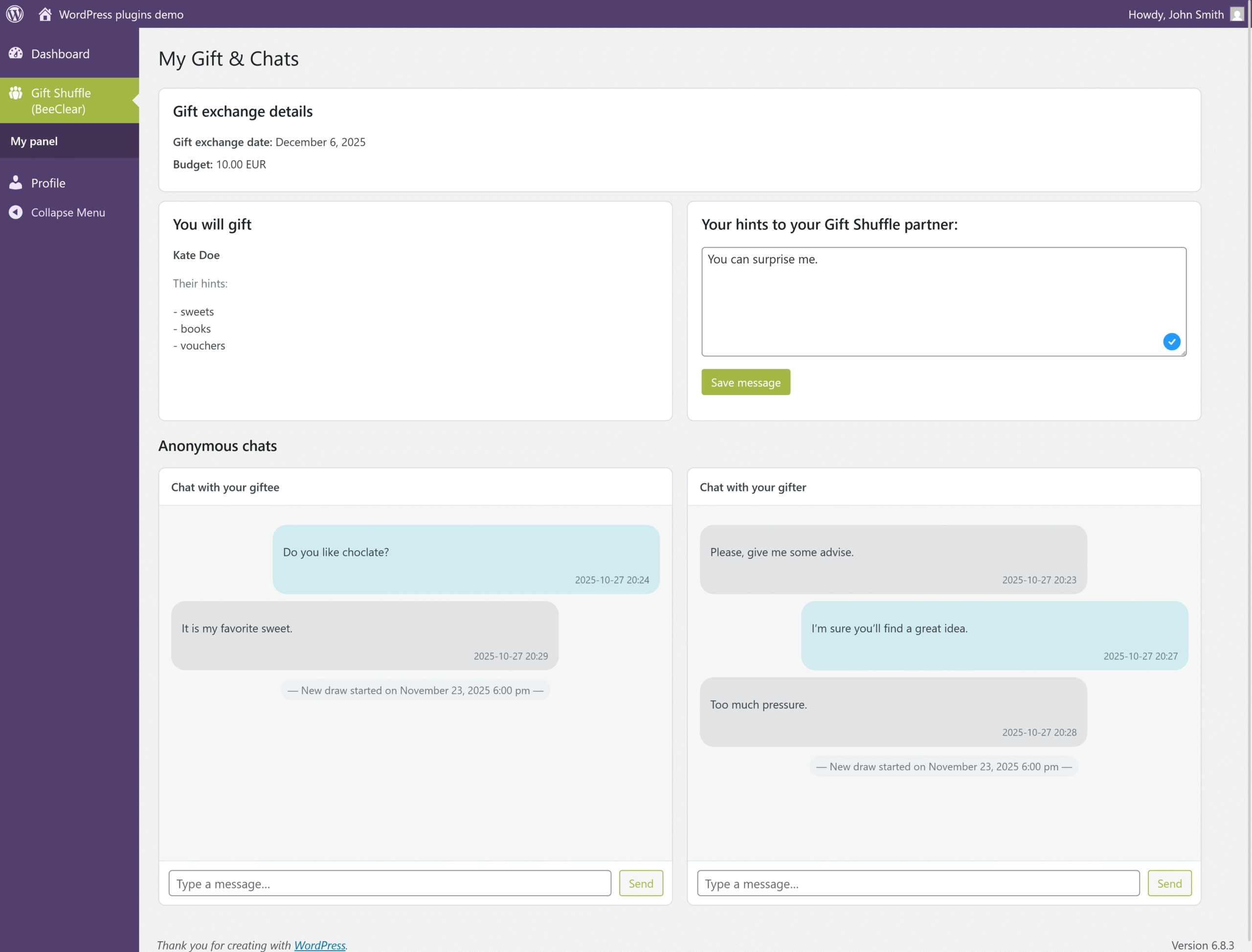 - The plugin offers two types of communication: anonymous 1:1 chats and a group chat. In the “My Gift & Chats” panel, the participant has two chat windows: one with the person they are gifting and one with the person gifting them. Users don’t see logins or email addresses – they communicate only within the plugin, and messages are simply marked as sent or received. Additionally, in the “Group chat” tab there is a chat for all participants in a given edition, where each person gets a random nickname such as “sunny penguin”. This chat is perfect for casual conversations, coordinating details of the exchange or asking general questions. The system automatically refreshes the view and can send email notifications about new messages.