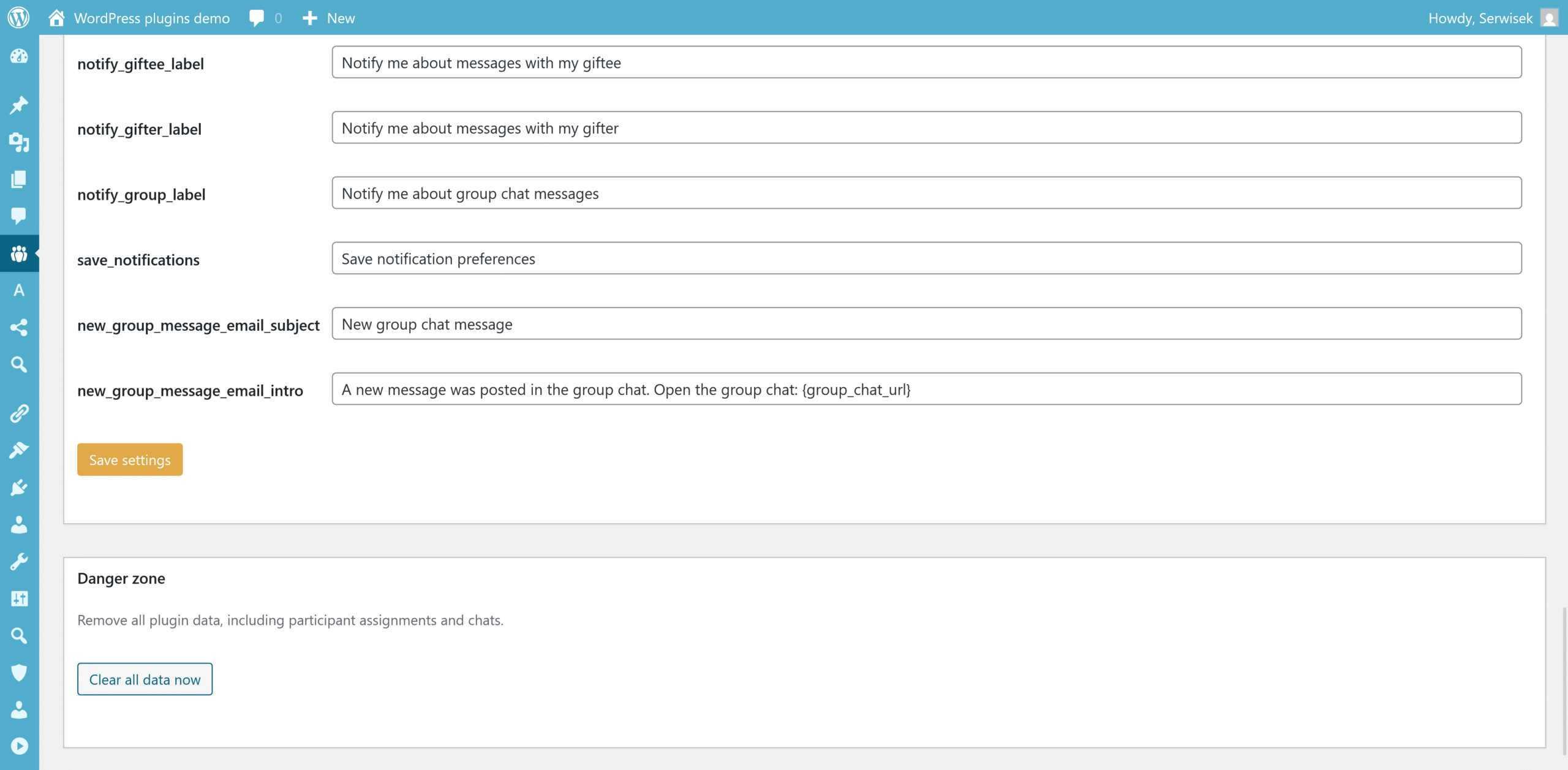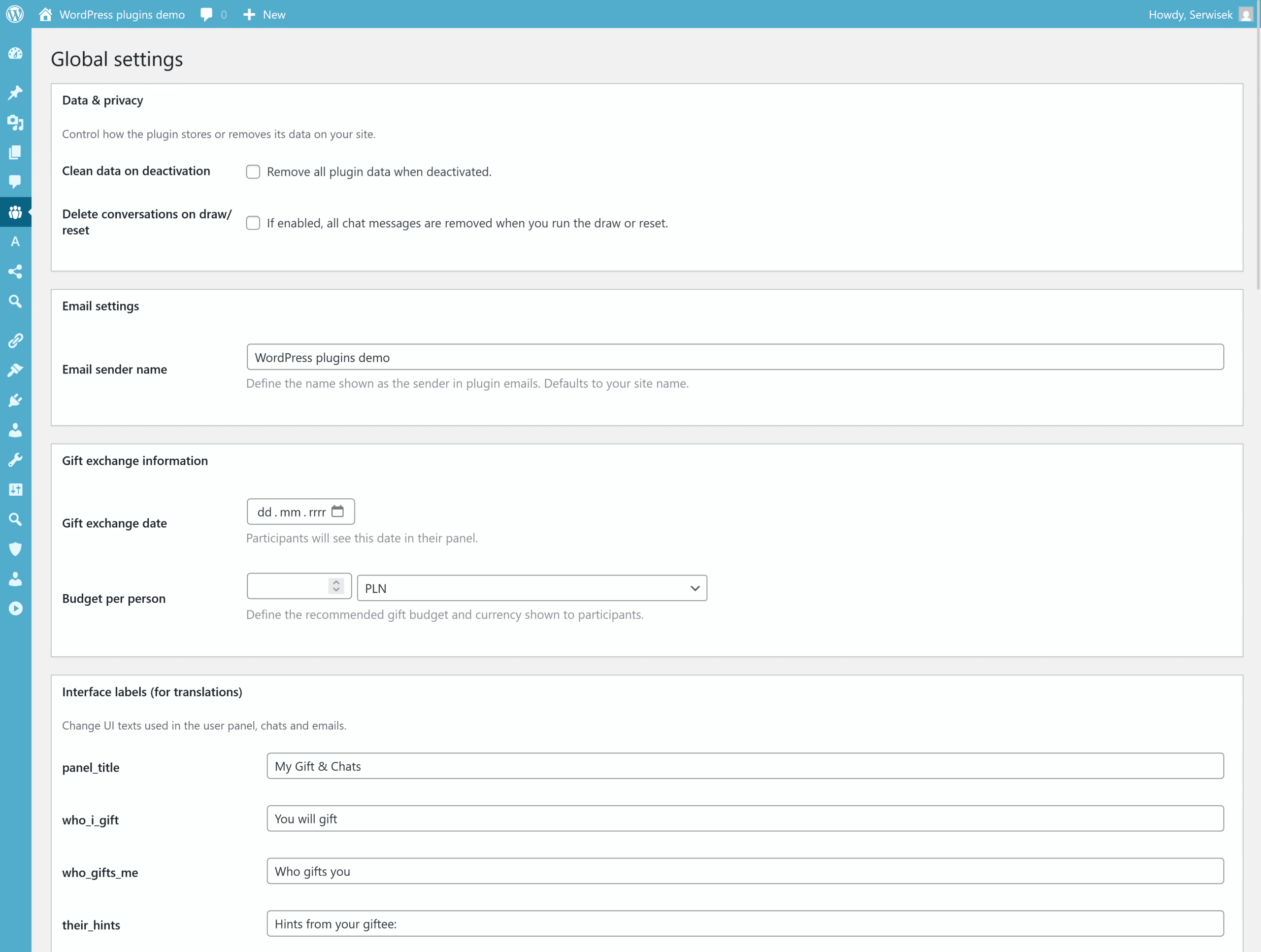 - Email notifications are partly managed by the administrator and partly by participants themselves. In Global settings you can set the sender name for emails and decide whether chats should be cleared on a new draw or reset. In their own panel, the participant has a “Notifications” section where they can enable or disable alerts about new messages in 1:1 chats and the group chat. You can create configuration backups via the Import/Export tab — there you generate a JSON file with settings, participants, assignments and messages, and you can restore it later on the same or another site. If you want to completely remove plugin data (assignments, chats, history), use the “Clear all data now” option in the “Danger zone” or enable automatic clean-up on deactivation.